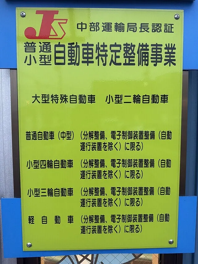 鮮やかな認証看板が目に入ると、今日もお客様の車を預かる一日が始まります。